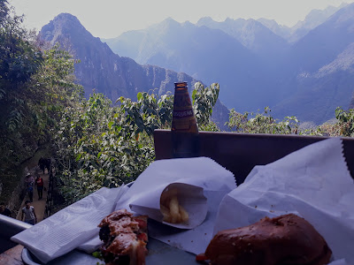 Fuera del recinto, me acerco a la cafetería para comer algo. Después de comer y tras casi una hora de tranquilo reposo disfrutando de las preciosas vistas que tengo desde la terraza, decido bajar andando a Aguas Calientes en lugar de tomar el autobús.
